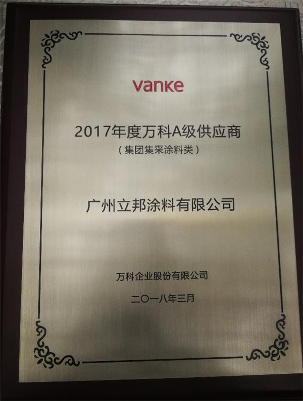 \u00A0 在深圳萬科總部舉辦的以“聚力同行 迎贏未來”為主題的萬科集團(tuán)合作伙伴春茗會上,立邦榮獲萬科2017年度A級供應(yīng)商稱號, 成為涂料類唯一獲選品牌,并獲萬科集團(tuán)十年長期合作獎(jiǎng)。從2013年開始入選A級供應(yīng)商名錄后,立邦涂料中國有限公司已連續(xù)五年榮膺“萬科A級供應(yīng)商”稱號。