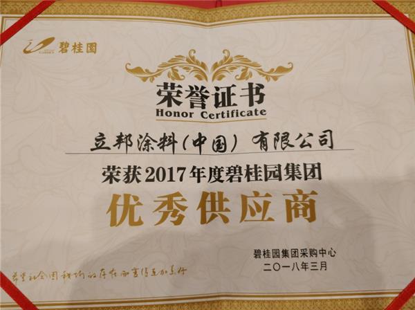 立邦獲得碧桂園集團(tuán)“2017年度碧桂園集團(tuán)優(yōu)秀供應(yīng)商獎(jiǎng)”