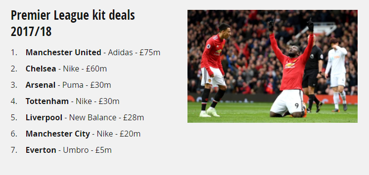 2013年,槍手和彪馬達(dá)成一致,2014-15賽季,阿森納球員才開始身著彪馬球衣亮相。但是目前他們的球衣贊助費(fèi)已經(jīng)遠(yuǎn)遠(yuǎn)落后于曼聯(lián)(7500萬(wàn)鎊/年)和切爾西(6000萬(wàn)鎊/年)。