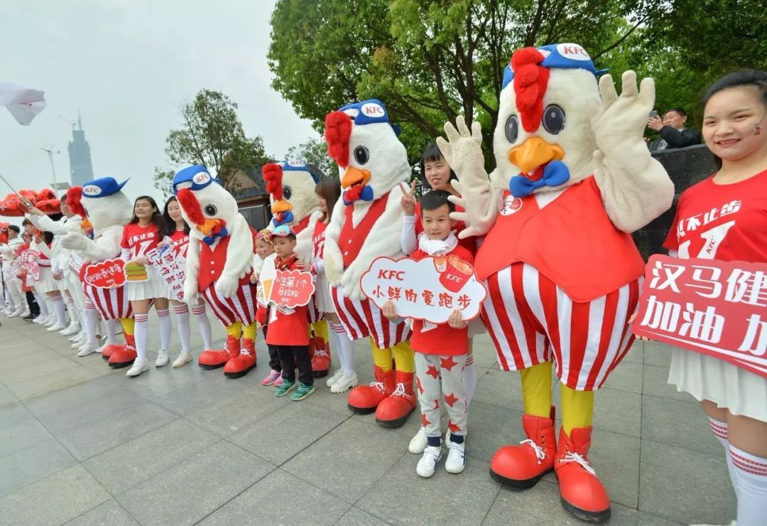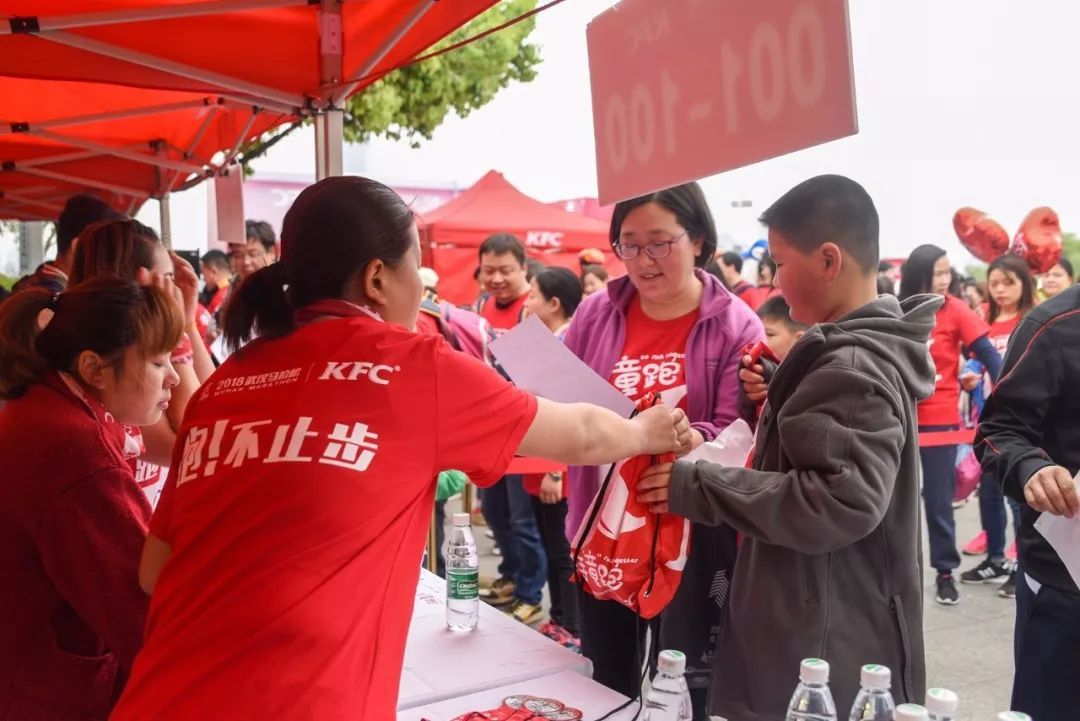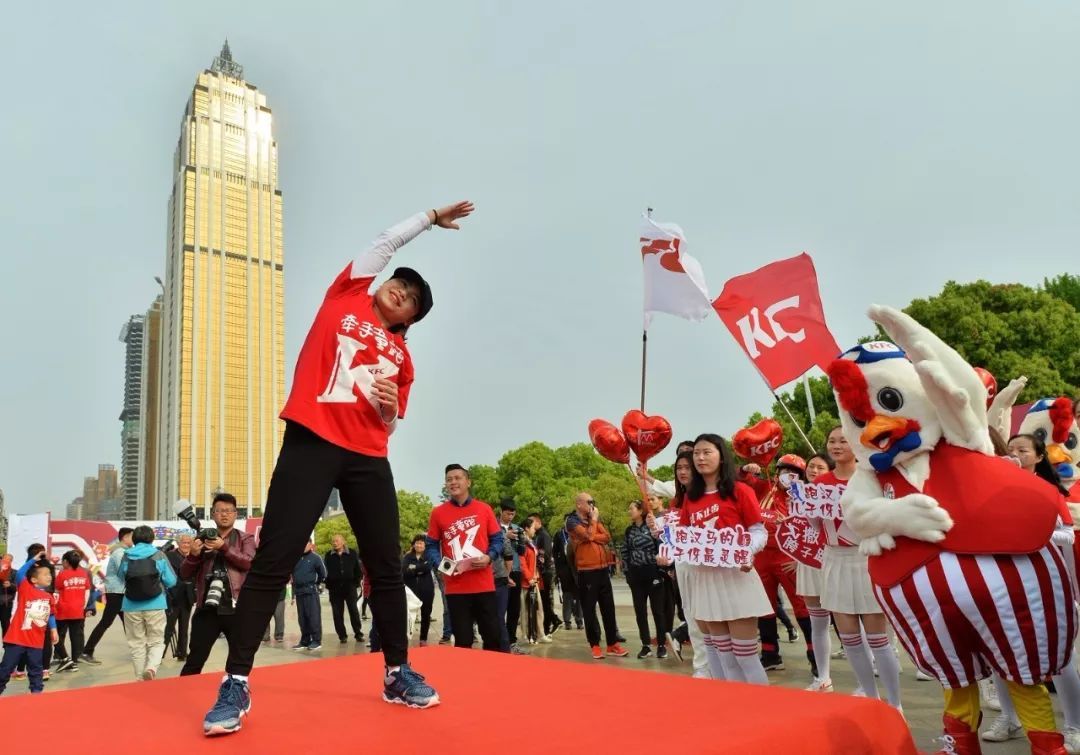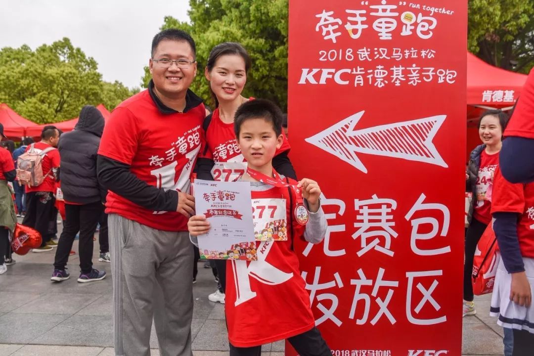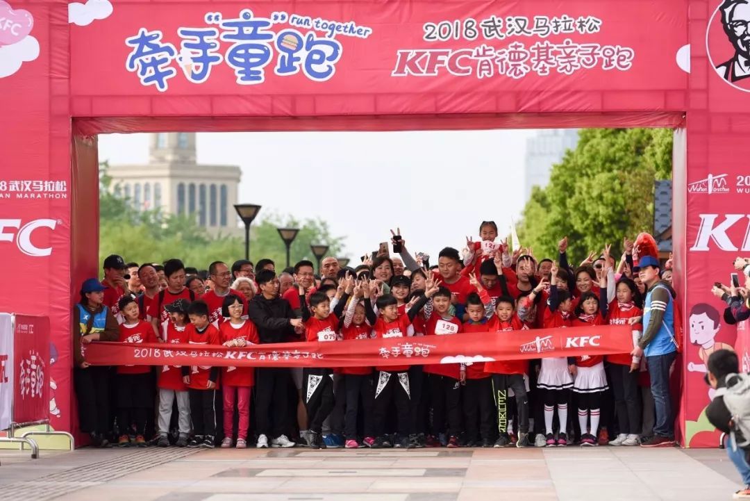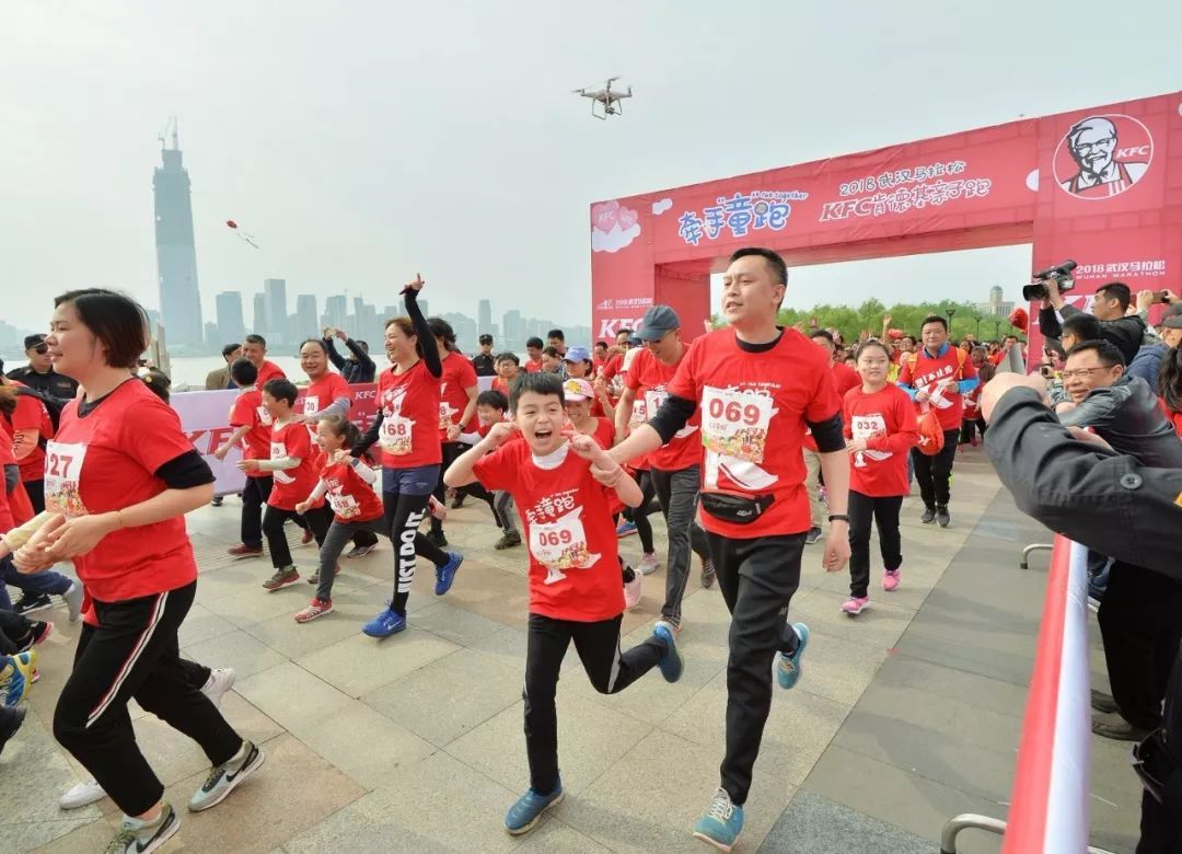 距離武漢馬拉松還有一天,2018武漢馬拉松KFC肯德基親子跑在武漢漢口江灘迎風開跑。