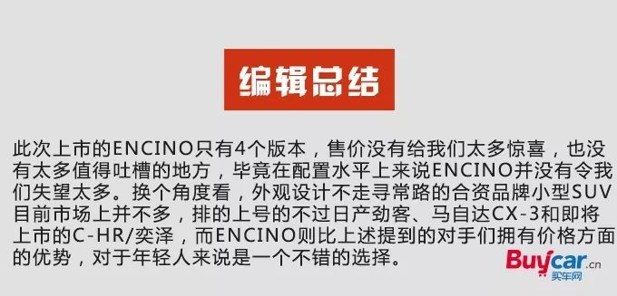 此次ENCINO共推出了4款車型,全系均搭載了與途勝相同的1.6T渦輪增壓發(fā)動(dòng)機(jī),匹配7速雙離合變速箱,這也讓它和搭載1.6L/1.4T發(fā)動(dòng)機(jī)但售價(jià)基本一致的現(xiàn)代ix25避免了產(chǎn)品重疊。13萬到15萬6的價(jià)格不算便宜,尤其在新一代智跑頂配車型才賣14萬的情況下。也許與Jeep自由光相同如出一轍的分體式大燈和個(gè)性的外觀才是大家選擇它的理由吧。
