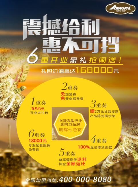 為慶祝明輝七色花品牌成立17周年,特推出鉅惠加盟扶持政策,開店即享免費(fèi)贈(zèng)送加盟費(fèi)用、免費(fèi)贈(zèng)送店鋪貨架、免費(fèi)贈(zèng)送店鋪設(shè)計(jì)、免費(fèi)開業(yè)上門指導(dǎo)、免費(fèi)店鋪銷售培訓(xùn)、免費(fèi)專屬金牌服務(wù)、免費(fèi)品牌宣傳推廣、免費(fèi)顧客管理系統(tǒng)、免費(fèi)提升品牌形象的九大增值服務(wù),助您輕松創(chuàng)業(yè)、高效開業(yè)、快速賺錢。