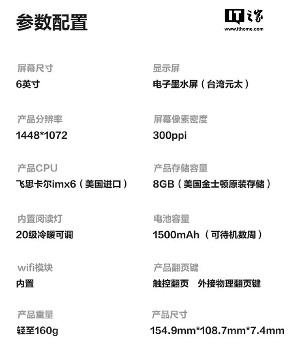 在配置方面,iReader T6采用了Carta 1.2標準E Ink電子墨水屏,1072*1448分辨率,300ppi,飛思卡爾imx6芯片組,8GB存儲,內置了20級閱讀燈,冷暖前光隨心可調,重量158克,厚度7.4mm,1500mAh電池,可連續閱讀數周。支持皮套喚醒和休眠,可外接物理翻頁鍵。
