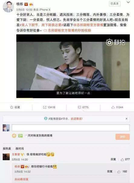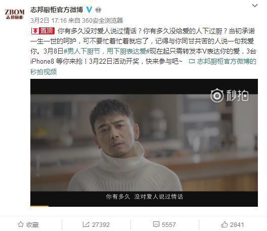 隨后推出正式視頻,同時(shí)建立了“轉(zhuǎn)發(fā)官微即可贏 iPhone8”的簡(jiǎn)單激勵(lì)活動(dòng)。志邦還有效驅(qū)動(dòng)多圈層微博KOL發(fā)聲,并邀請(qǐng)楊爍在微博鼓勵(lì)男人用下廚表達(dá)愛(ài)。