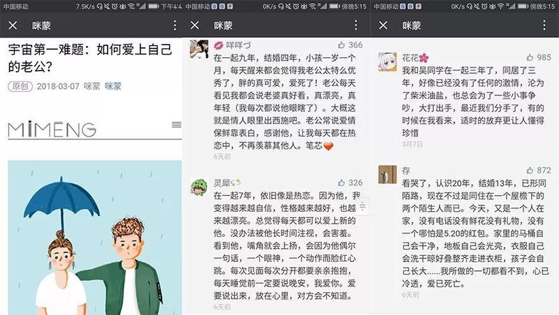 微信KOL以品牌性質(zhì)與軟文性質(zhì)為兩大方向多維度引導(dǎo),實(shí)現(xiàn)促銷(xiāo)信息與品牌理念的傳播。自媒體大V咪蒙以一篇《宇宙第一難題:如何愛(ài)上自己的老公?》戳中萬(wàn)千女人心,閱讀量瞬間突破10w+,引發(fā)優(yōu)質(zhì)UGC的產(chǎn)生。