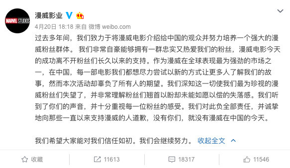 4月23日下午,迪士尼影業(yè)在上海進行了一次媒體通氣會,對于上周在上海進行的《復仇者聯(lián)盟3:無限戰(zhàn)爭》中國首映式上發(fā)生的一系列狀況()以及引發(fā)的粉絲不滿和輿論事件做出了回應和說明。 迪士尼影業(yè)的負責人對《復聯(lián)3》首映活動中出現(xiàn)的問題向粉絲道歉,并且透露以后不會再邀請藝人作為“中國代言大使”。