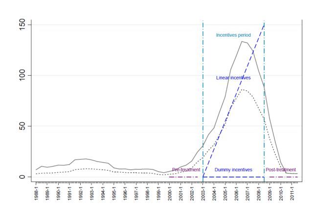 (3)關(guān)于司法制度和地方安全。實施高能激勵的時期,在上校領(lǐng)軍較多的地區(qū),地方司法無效率指數(shù)顯著增長。更糟的是,在上校領(lǐng)軍聚集的地區(qū),來自反政府軍和游擊隊的襲擊顯著增長,甚至持續(xù)到2008年之后。可能的原因是,政府軍的殺民行為,導(dǎo)致民眾對當?shù)厮痉ㄖ贫群蛙婈爢适判模炊鰪娏伺衍姷牧α俊?/p>