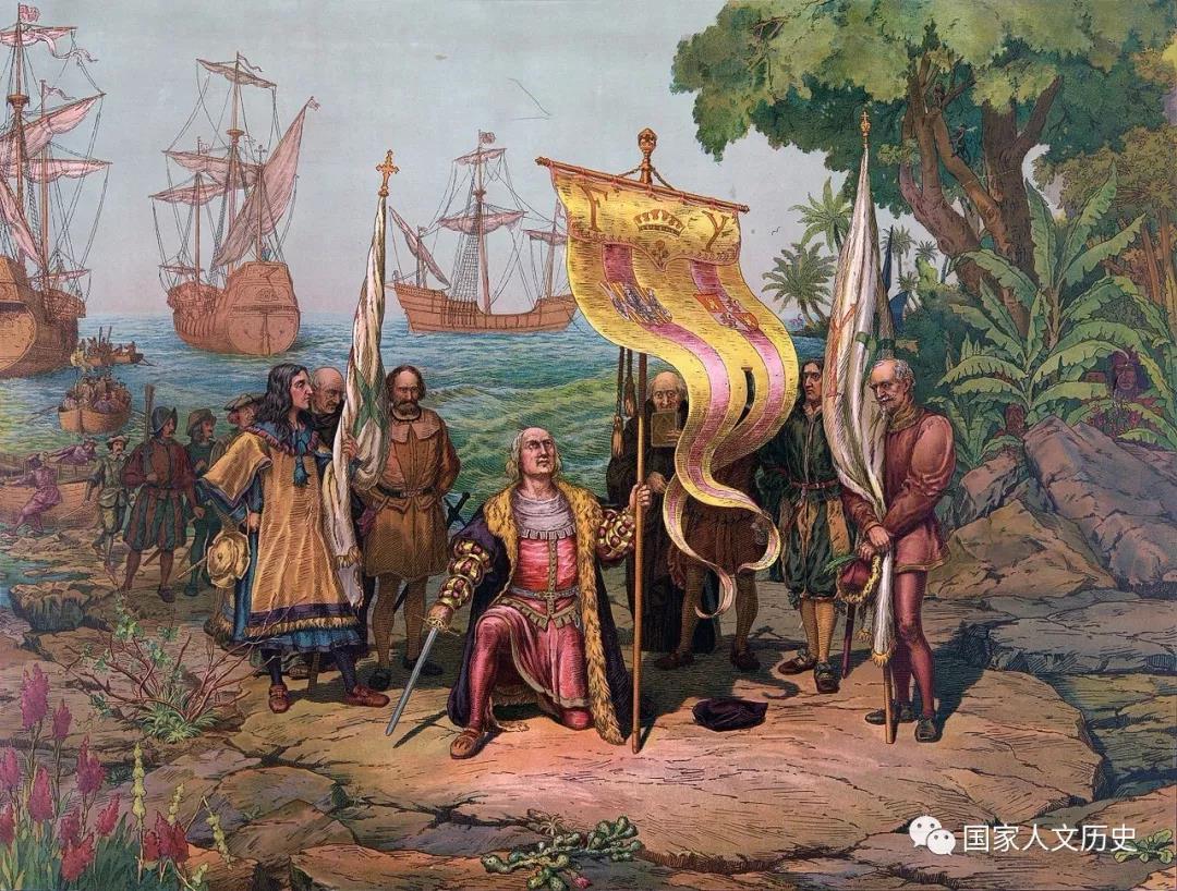 哥倫布登上伊斯帕尼奧拉島,宣布這里是西班牙的領(lǐng)土