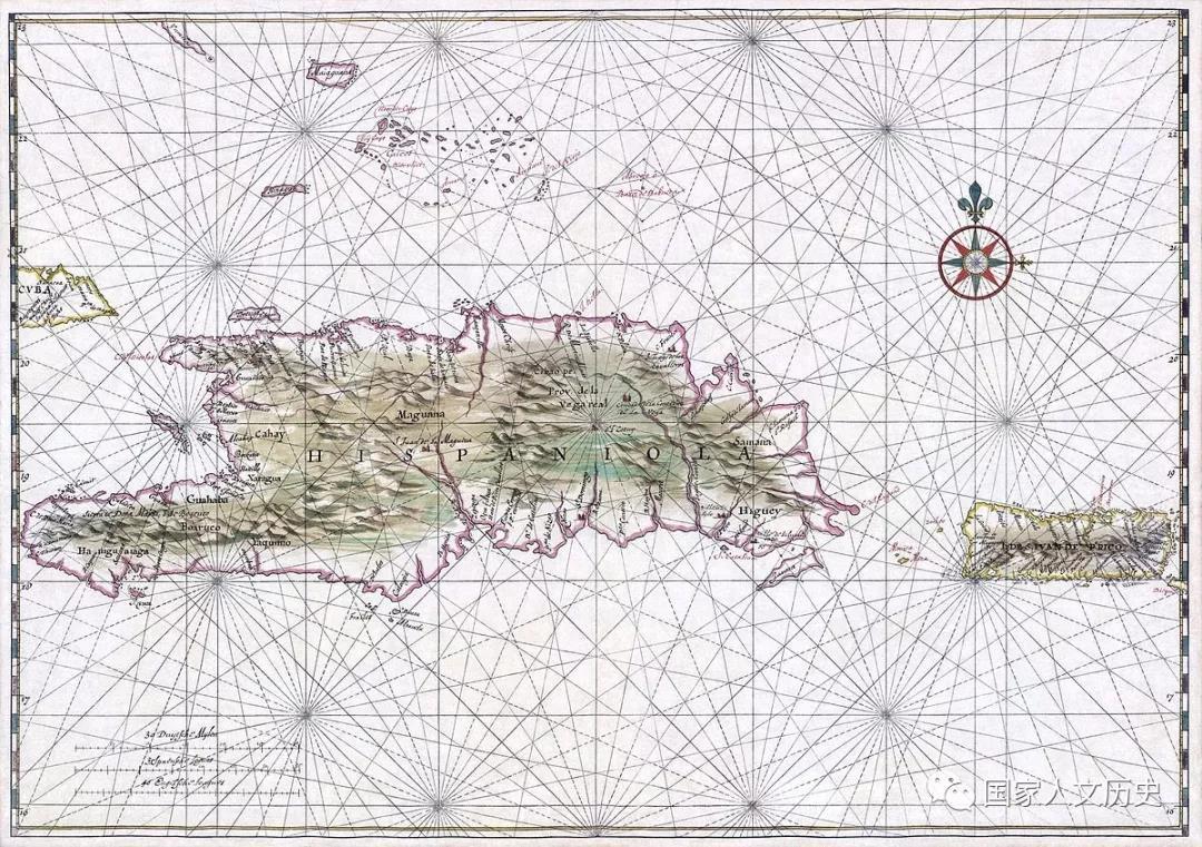 1639年制航海圖,上面繪制了伊斯帕尼奧拉島與波多黎各島,其中波多黎各(Puerto Rico)意為富饒海岸