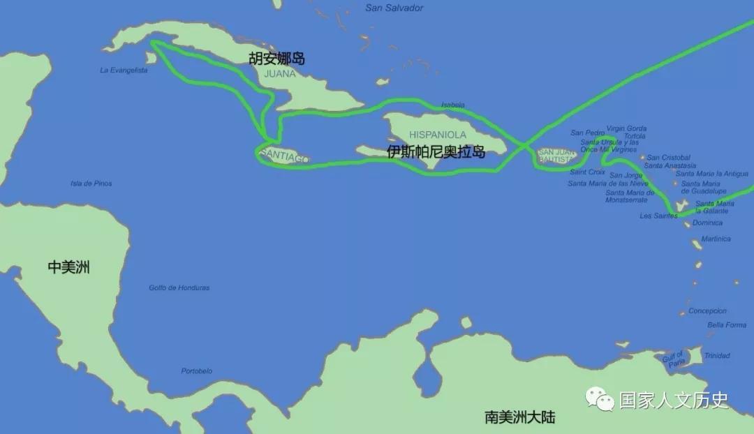 哥倫布第二次航行路線圖,當(dāng)時探索古巴島時以為這里是亞洲延伸而出的半島