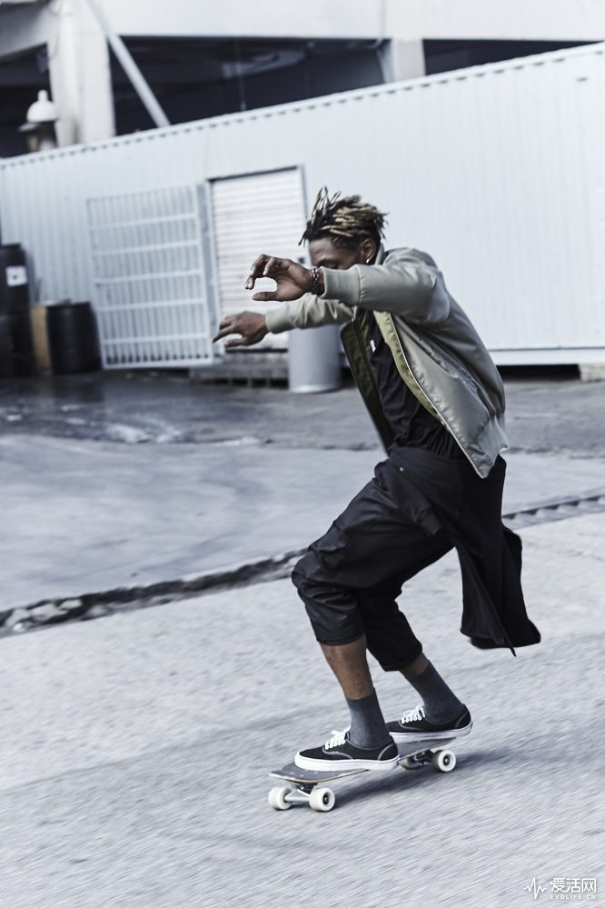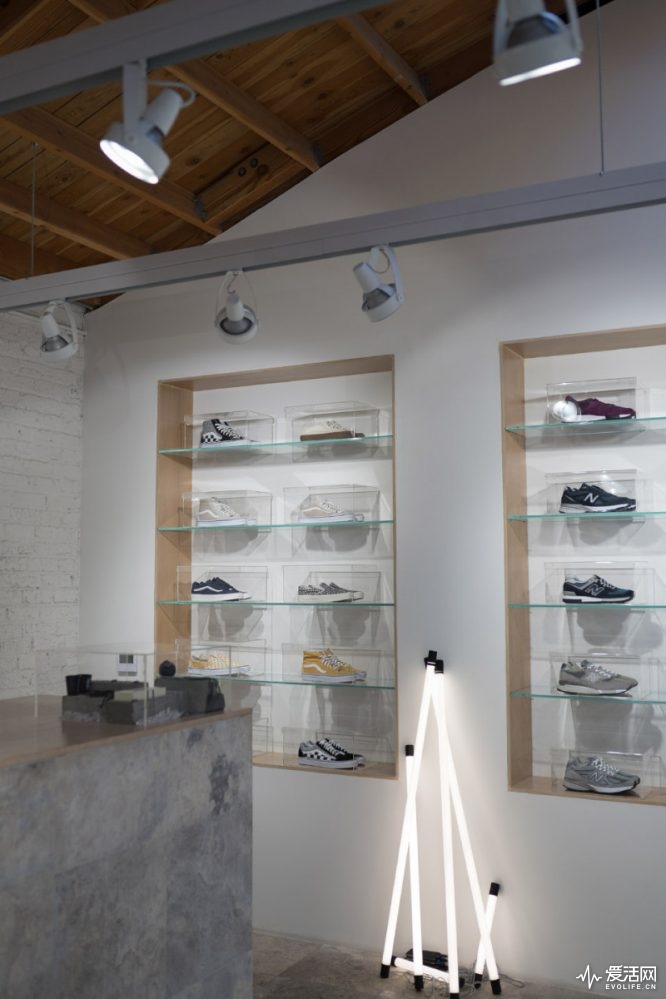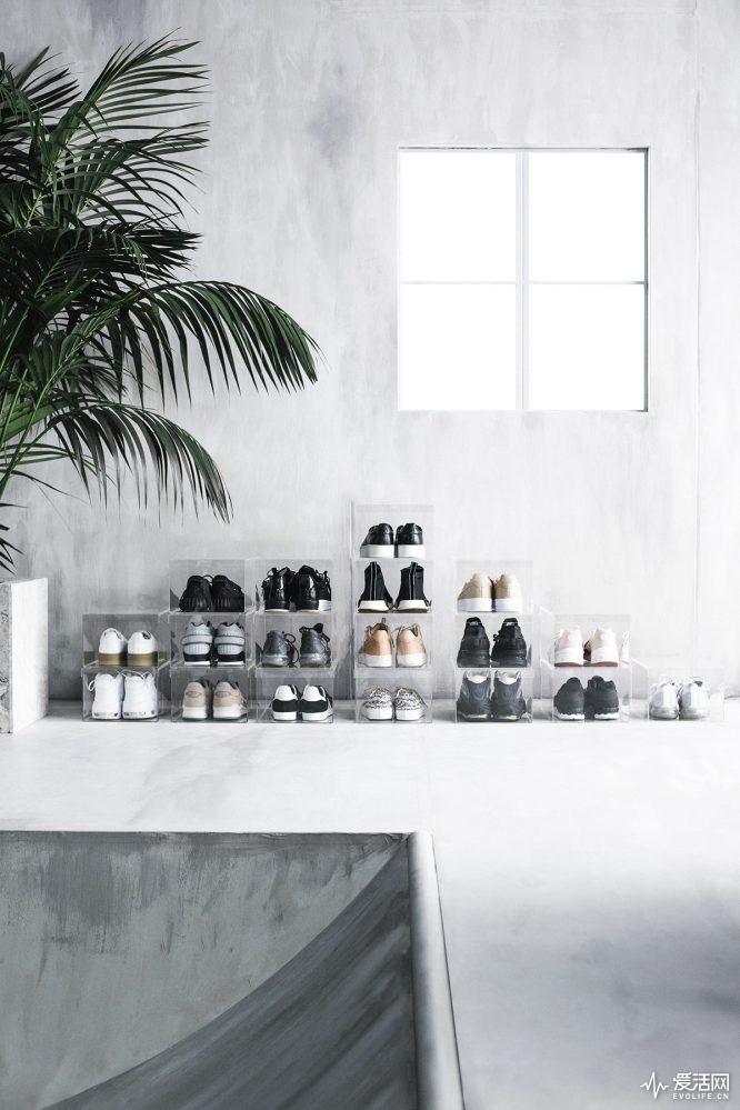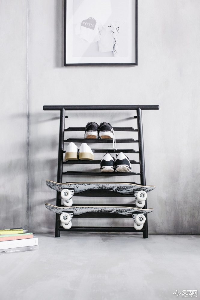 滑板是最地道的街頭生活的武裝,Chris Stamp還為滑板與球鞋專門(mén)設(shè)計(jì)了一套架子。在節(jié)省空間的同時(shí),特殊的材質(zhì)設(shè)計(jì)還能完美地固定住滑板。