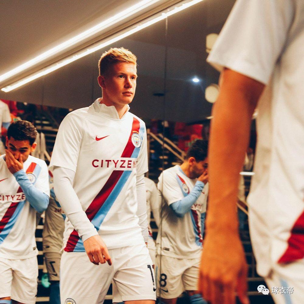這款奪冠版賽前球衣以白色為基調(diào),球衣胸前加入天藍(lán)色與栗紅色所組成的綬帶,這兩種顏色源自于本賽季曼城主客場球衣。