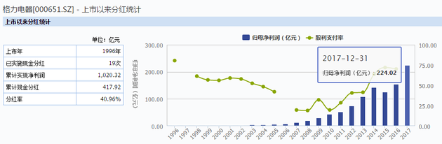 從格力電器歷史分紅數(shù)據(jù)上來看,自從1996年上市以來總共實施現(xiàn)金分紅19次,只有3次未分紅,分別是1996年、2006年和2017年,自上市以來累計現(xiàn)金分紅417億元,其分紅率達40.96%。