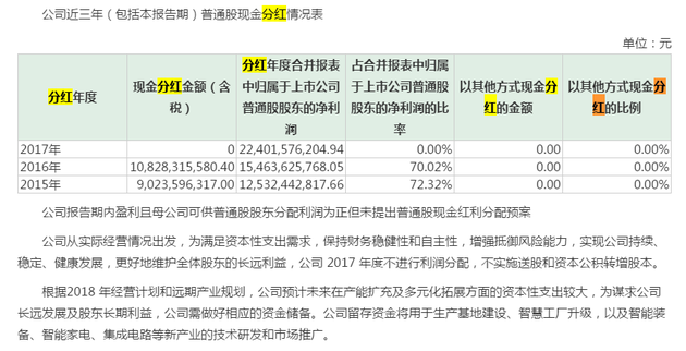 至于本次格力電器不分紅的理由,其2017年年報中解釋稱是將利潤留存在公司用于發(fā)展生產(chǎn)基地、智慧工廠及進行智能產(chǎn)業(yè)、集成電路等新產(chǎn)業(yè)的研發(fā)與推廣。從而實現(xiàn)公司持續(xù)、穩(wěn)定、健康發(fā)展,更好地維護全體股東的長遠利益。
