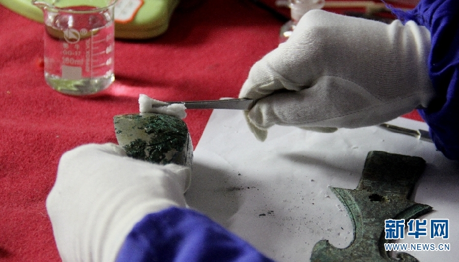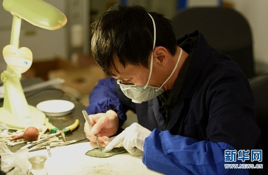 “文物醫(yī)生”在為一件青銅器“療傷”。新華網 馬航 攝