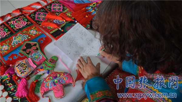 一進(jìn)安玉芬家門(mén),就聽(tīng)到她口中哼唱著民族小調(diào),手中正粘貼剛剛剪好的刺繡圖樣。在安玉芬家中,隨處可見(jiàn)各式各樣十分精致的裕固族服飾、配飾。她以認(rèn)真的態(tài)度對(duì)待著每個(gè)作品,親自打樣、包邊、刺繡、串珠,“上面是銀牌、紅色珊瑚珠、瑪瑙,下面孔雀石、珍珠、珠貝,用銅環(huán)串綴而成,這個(gè)叫頭面。綠色系腰下有針線包、香包梳子袋、鏡子袋……”安玉芬細(xì)心地講解著。為了保護(hù)傳統(tǒng)裕固族服飾,繼承發(fā)揚(yáng)原始民族文化,她悉心珍藏著每類作品,刺繡圖案也逐一繪制記錄在冊(cè),方便學(xué)徒們學(xué)習(xí)、參考并代代相傳。
