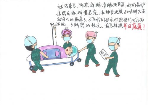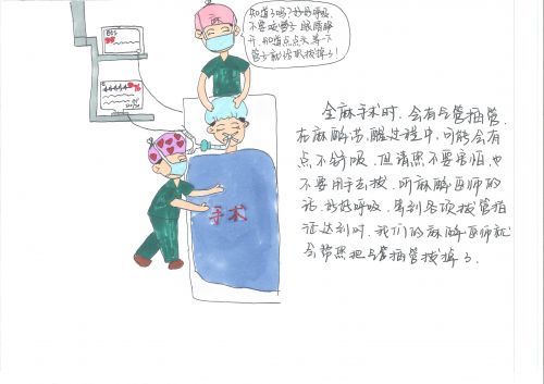 比如,第13、14部分針對麻醉進(jìn)行答疑解惑。“如果您是全身麻醉,手術(shù)全過程您是睡著的,手術(shù)完畢后會慢慢清醒,這個時候您的喉嚨會不舒服,我們會給您吸痰,拔管等,您聽到我們的呼喊您的名字時,還請您配合我們好好呼吸。”“如果您是全身麻醉,手術(shù)全過程您是睡著的,手術(shù)完畢后會慢慢清醒,這個時候您的喉嚨會不舒服,我們會給您吸痰,拔管等,您聽到我們呼喊您的名字時,還請您配合我們好好呼吸。”