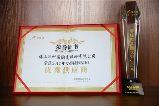 歐神諾陶瓷-“碧桂園2017年度優(yōu)秀供應商”證書與獎杯