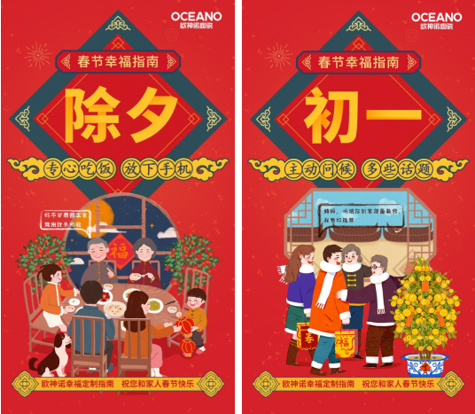 歐神諾幸福指南春節(jié)海報(bào),通過(guò)對(duì)不同的新年團(tuán)聚場(chǎng)景,支招各種幸福小方法:多一點(diǎn)體諒、包容和熱愛(ài),讓這個(gè)新春過(guò)的更溫馨、幸福。