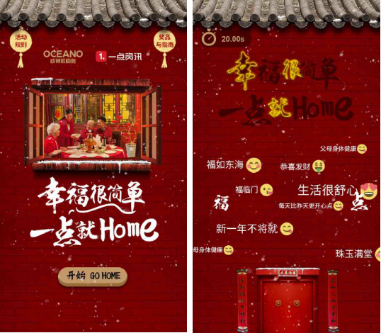 據(jù)悉,歐神諾“幸福”營(yíng)銷(xiāo)在2018年新春前夕便已開(kāi)啟,并通過(guò)平面廣告、微電影、創(chuàng)意H5、小游戲等形式,對(duì)于“幸福很簡(jiǎn)單,回家就好”這一主題進(jìn)行解讀。