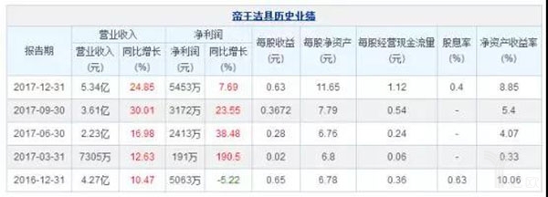 日前,帝王潔具發(fā)布2017年年報(bào),其營(yíng)業(yè)收入5.34億元,同比增長(zhǎng)24.85%;歸屬于上市公司股東的凈利潤(rùn)5453萬(wàn)元,同比增長(zhǎng)7.69%。基本每股收益0.63元。在2018年第一季度業(yè)績(jī)預(yù)告,預(yù)計(jì)2018Q1實(shí)現(xiàn)歸屬于上市公司股東的凈利潤(rùn)為0.38億元~0.39億元,同比增長(zhǎng)1890%-1940%;業(yè)績(jī)預(yù)計(jì)同比大幅增長(zhǎng)的主要原因?yàn)楹喜W神諾一季度的財(cái)務(wù)數(shù)據(jù)所致。