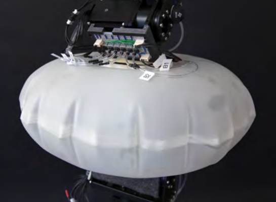 機(jī)器人手指也十分柔軟,充滿氣體;它們是在 3D 打印機(jī)中制造出來的,可以放在堅(jiān)硬和柔性材料下面。例如,每個(gè)充氣手指內(nèi)的壓力感應(yīng)器可以讓機(jī)器人知道,指尖是否壓得太用力,或是承受了所有的重量,然后指示它調(diào)整抓握力。