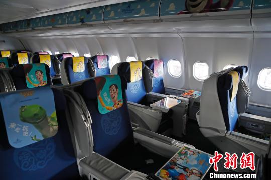 走進(jìn)客艙,機(jī)艙頂部、行李架、座椅頭片……隨處可見豐富的玩具總動員主題元素。 殷立勤 攝
