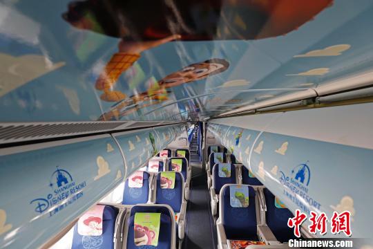 客艙內(nèi),色彩繽紛的小桌板突出呈現(xiàn)了新園區(qū)的全新景點(diǎn),屏幕中還播放著全新宣傳片,盛情邀請乘客前往迪士尼?皮克斯玩具總動員一探究竟。 殷立勤 攝