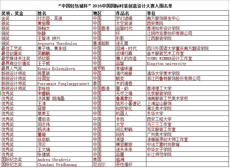 經(jīng)過激勵(lì)的競爭, 來自江西南方服飾研發(fā)中心設(shè)計(jì)師付志臣、吳迪斬獲金獎(jiǎng);來自西安美術(shù)學(xué)院的黃麗霖和香港知專設(shè)計(jì)學(xué)院的陳翰文摘得銀獎(jiǎng);來自塞浦路斯的設(shè)計(jì)師Avgousta Theodoulou,江西服裝學(xué)院教師王智沛、鐘興,江陰市宏泰紡織有限公司張靜榮獲銅獎(jiǎng);而單項(xiàng)獎(jiǎng)、新銳設(shè)計(jì)師獎(jiǎng)、國際紀(jì)念獎(jiǎng)也花落各家。