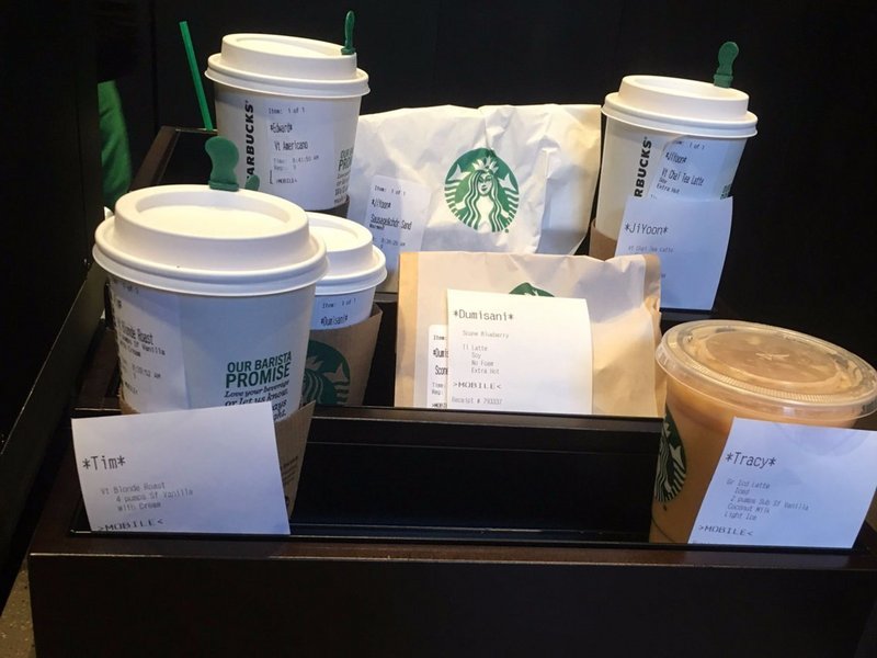 下圖中,我們可以看到星巴克的員工將標(biāo)簽訂單放入代收貨架前,然后一個個呼喊顧客的名字。