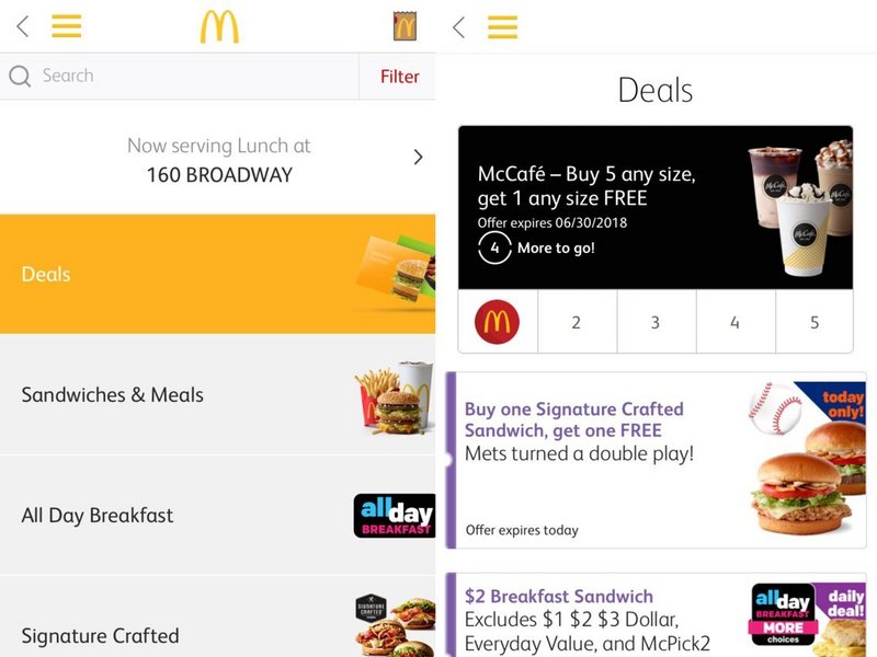 作為快餐連鎖店,麥當(dāng)勞的移動應(yīng)用程序不像星巴克那么時髦,但它絕對更專注于交易便捷性。雖然星巴克也為用戶提供了優(yōu)惠,但麥當(dāng)勞把折扣優(yōu)惠放在移動應(yīng)用最中心的位置。