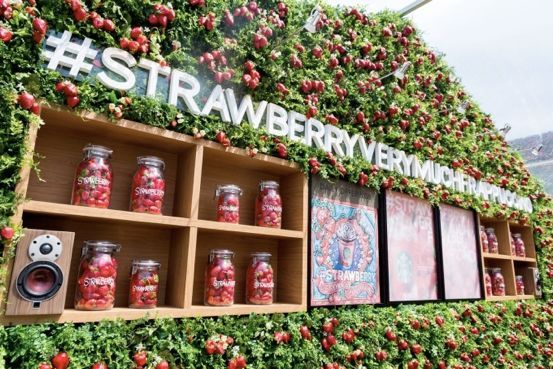 與愚人節(jié)當(dāng)天的預(yù)告毫無出入,這間快閃店果然被布置成了一間種著真草莓的塑料大棚。從最深處木質(zhì)壁櫥上的罐裝草莓,到遍布棚內(nèi)棚外等待采摘的新鮮生草莓、透明墻面上的粉紅色草莓插畫,再到停在一旁的草莓主題快閃飲品車,加上環(huán)繞在整個空間內(nèi)的輕快音樂,這里的每個細(xì)節(jié)都在努力呈現(xiàn)出“可以用五感體驗到的草莓星冰樂”這一鮮明主題。通透的陽光、盎然的綠意,路過的每個行人都難以抗拒這波突如其來的“草莓風(fēng)暴”。