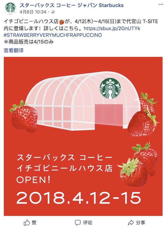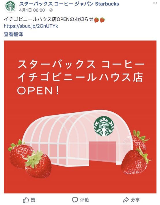 4月1日一大早,日本星巴克官方Facebook發(fā)布了一條“草莓大棚店”的開店通知,短短一句話,一張圖,卻似乎有著神奇的魔力。在所有人被愚人節(jié)玩笑欺騙了無數(shù)次的特殊時期,這個消息一放出馬上就招來上千條回復(fù),與平時最多幾十條評論形成了鮮明對比。盡管大家都覺得只是個玩笑,但這個前所未見的腦洞的確在社交媒體上引起了不小的轟動。