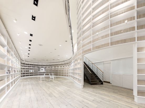 為了更突出地強(qiáng)調(diào)“圖書館”這個概念,nendo將書架設(shè)計成了貫穿全館的流線形,高度上也占滿了天花板到地面的整個垂直空間。同時,為了避免像普通圖書館一樣顯得過于秩序化、過于莊嚴(yán),nendo并沒有選擇將書架上的每個空隙填滿,而是零零星星地將少量的圖書和相關(guān)商品像精品陳列廳一樣分布陳列。