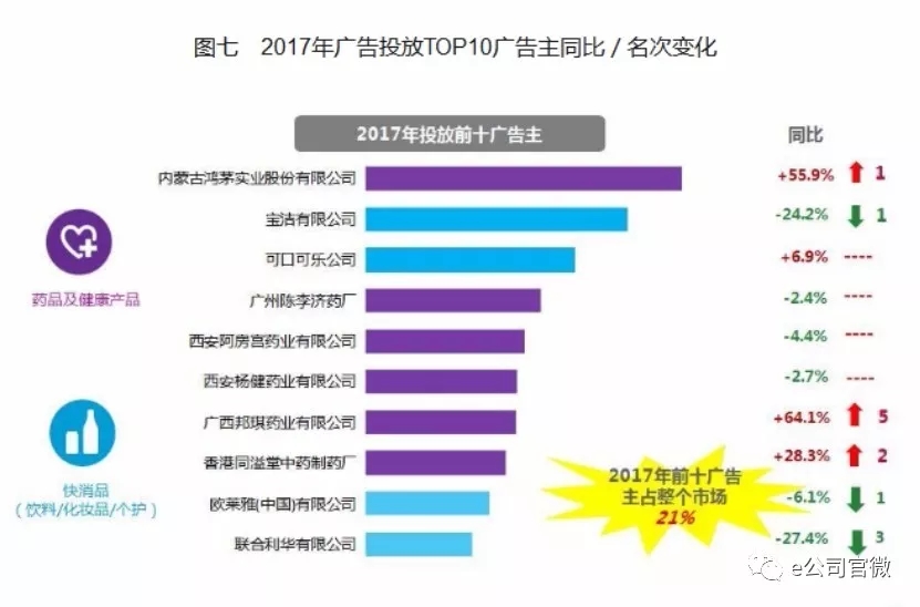 尼爾森網(wǎng)聯(lián)AIS全媒體廣告監(jiān)測顯示,去年1月至11月,內(nèi)蒙古鴻茅實(shí)業(yè)股份有限公司替代寶潔有限公司位列投放廣告企業(yè)第一,投放總額同比增長55.9%,寶潔有限公司以同比下降24.2%的成績位列第二,其老對手聯(lián)合利華有限公司在傳統(tǒng)媒體投放上降幅最大,減少27.4%,排名第十位。
