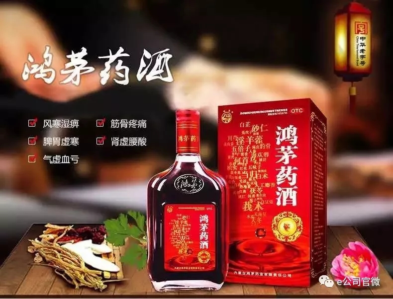 據(jù)鴻茅藥酒網(wǎng)站介紹,“鴻茅藥酒始創(chuàng)于1739年,由著名民間藥王王吉天在內(nèi)蒙古涼城鴻茅鎮(zhèn)創(chuàng)辦的‘榮盛坊’根據(jù)祖?zhèn)髅胤脚谥疲煞职ǎ呶叮汉问诪酢⒌攸S、白芷、山藥、五倍子、廣藿香、人參、桑白皮、海桐皮、甘松、獨(dú)活、蒼術(shù)、川芎、菟絲子、茯神、青皮、草果、山茱萸、附子、厚樸、陳皮、五味子、牛膝、枳實(shí)、高良姜、山柰、款冬花、小茴香、桔梗、熟地黃、九節(jié)菖蒲、白術(shù)、檳榔、甘草、當(dāng)歸、秦艽、紅花、莪術(shù)、蓮子、木瓜、麥冬、羌活、香附、肉蓯蓉、黃芪、天冬、桃仁、梔子、澤瀉、烏藥、半夏、天南星、苦杏仁、茯苓、遠(yuǎn)志、淫羊藿、三棱、茜草、砂仁、肉桂、白豆蔻、紅豆蔻、蓽茇、沉香、豹骨、麝香、紅曲等。主要功效包括:祛風(fēng)除濕、補(bǔ)氣通絡(luò)、舒筋活血、健脾溫腎。適用于以下病癥:風(fēng)寒濕痹、筋骨疼痛、脾胃虛寒、腎虧腰酸及婦女氣虛血虧。”