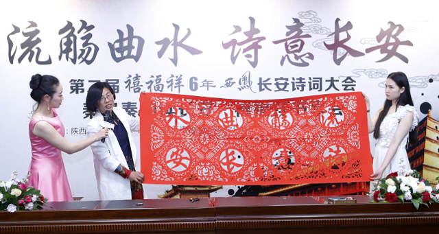 陜西省非物質(zhì)文化遺產(chǎn)保護中心副主任修劍橋,中國當代皮影藝術(shù)第一人、中國非物質(zhì)文化遺產(chǎn)傳承人、國家資深皮影鑒定專家汪天穩(wěn),陜西省美術(shù)家協(xié)會會員、西安市婦聯(lián)手工藝聯(lián)盟秘書長朱丹紅作為主講嘉賓,對陜西非物質(zhì)文化遺產(chǎn)的解析、非遺項目保護、技藝傳承等方面進行了主題分享。同時,作為剪紙技藝傳承人,朱丹紅還為本屆詩詞大會創(chuàng)作了一幅“流觴曲水 詩意長安”的巨型剪紙藝術(shù)作品,將本次活動推向了高潮。