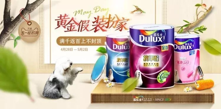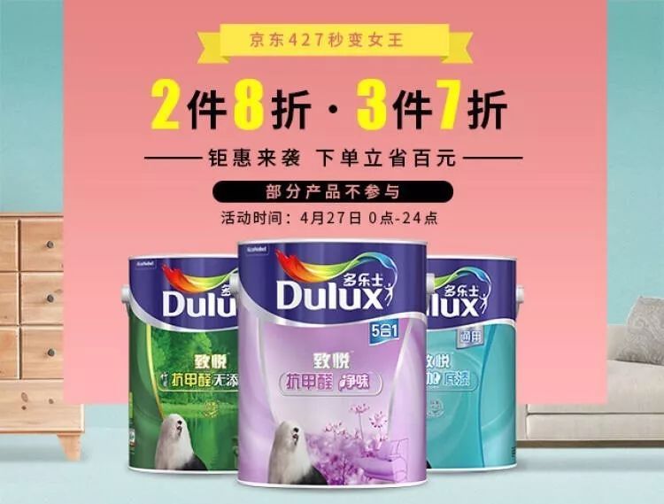 五一活動(dòng):4月28日—5月2日,天貓多樂(lè)士官方旗艦店“黃金假裝扮家”活動(dòng),漆類(lèi)產(chǎn)品滿(mǎn)千返百,上不封頂,再加滿(mǎn)額有禮;此外,參與天貓五一狂歡周活動(dòng),4月28日零點(diǎn)開(kāi)始,前一個(gè)小時(shí)立減100優(yōu)惠,其他聚劃算活動(dòng)產(chǎn)品也是不在少數(shù)。但其京東旗艦店暫無(wú)明確的五一促銷(xiāo)噱頭,除了4月的京東家裝節(jié)“跨萬(wàn)店4免1”活動(dòng),還有4月27日的“京東427秒變女王”優(yōu)惠,2件8折,3件7折,而后或?qū)⑼瞥鑫逡烩牷荽黉N(xiāo),近期有家裝打算的消費(fèi)者就要好好關(guān)注其動(dòng)態(tài)了,機(jī)不可失。