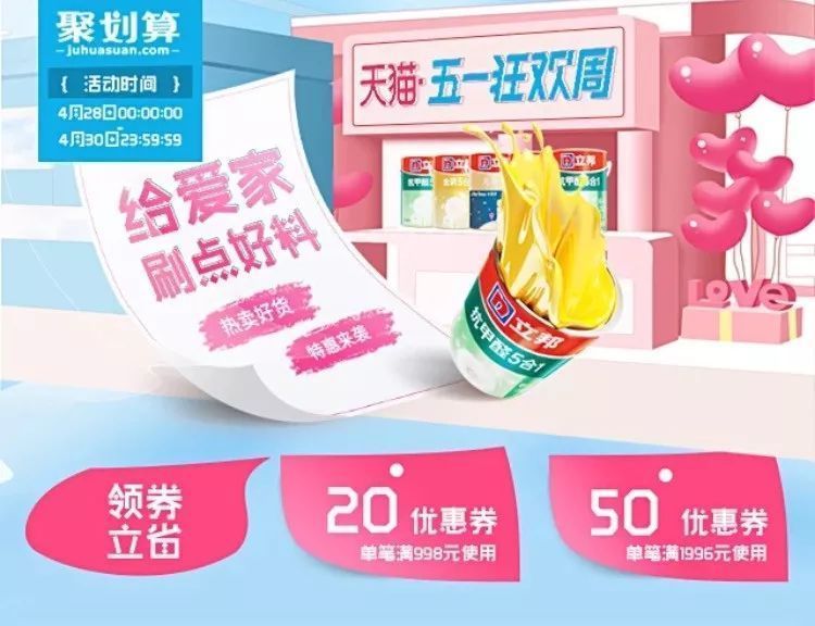 五一活動(dòng):4月28日—4月30日,天貓立邦漆官方旗艦店“給愛(ài)刷點(diǎn)好料”五一狂歡周活動(dòng),領(lǐng)券立省;其京東旗艦店的活動(dòng)則更加豐富,優(yōu)惠力度大,3月30日—5月2日“立邦春季家裝節(jié)”活動(dòng),部分4免1、爆款直降、部分滿(mǎn)999減300,關(guān)注砸金蛋,加購(gòu)送禮等優(yōu)惠。