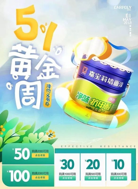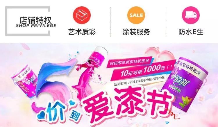 五一活動(dòng):4月26日,武漢嘉寶莉涂裝藝術(shù)館成立,這是繼龍江館、清豐館后的第三藝術(shù)館,足見(jiàn)其專(zhuān)業(yè)的涂裝底蘊(yùn)。相信五一將至,各線(xiàn)上渠道及其門(mén)店,優(yōu)惠一定少不了。天貓嘉寶莉旗艦店“51黃金周,降價(jià)又有券”、均為期一個(gè)月的京東嘉寶莉旗艦店“跨店4免1”活動(dòng)(4月2日—5月2日)、“價(jià)”到愛(ài)漆節(jié)(4月29日—5月29日),足月狂歡,優(yōu)惠樂(lè)享不停。