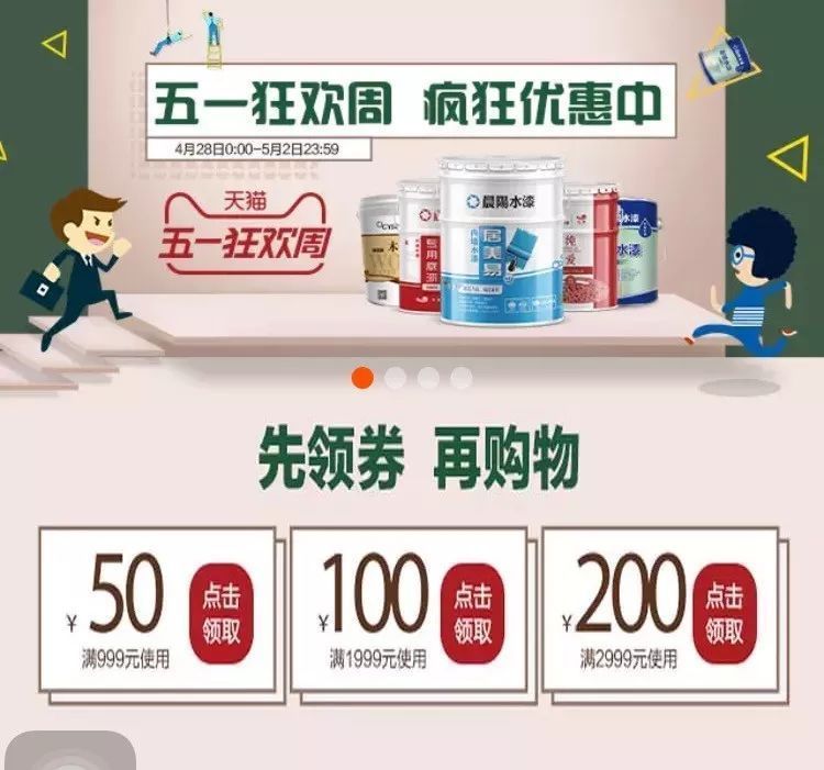 五一活動(dòng):4月28日—5月2日,天貓三棵樹(shù)官方旗艦店“五一勞動(dòng)節(jié)狂歡周”活動(dòng),領(lǐng)券滿(mǎn)減,下單必?fù)專(zhuān)駳g抽獎(jiǎng)等。京東三棵樹(shù)漆官方旗艦店則是參加京東家裝節(jié),跨萬(wàn)店4免1。