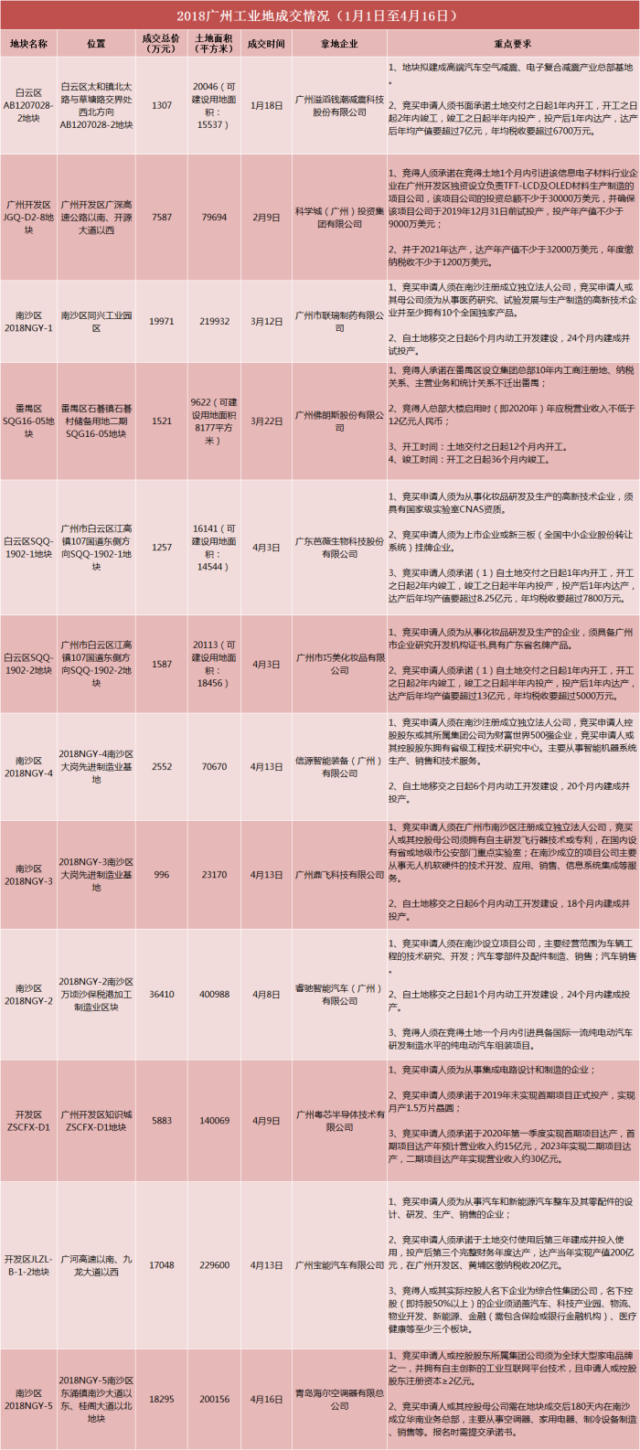 到目前為止,廣州今年(1月1日至4月16日)共成出讓12宗工業(yè)地塊,攬金11.4億,涉及白云、開發(fā)區(qū)、南沙、番禺等區(qū)域,拿地企業(yè)多為高新技術(shù)企業(yè),且多宗地塊被要求設(shè)立總部集團或者華南總部。