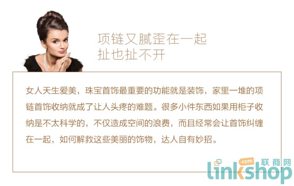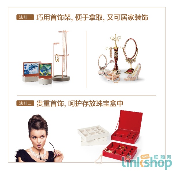 女人天生愛(ài)美,珠寶首飾最重要的功能就是裝飾,家里一堆的項(xiàng)鏈?zhǔn)罪検占{就成了讓人頭疼的難題。很多小件東西如果用柜子收納是不太科學(xué)的,不僅造成空間的浪費(fèi),而且經(jīng)常會(huì)讓首飾糾纏在一起,如何解救這些美麗的飾物,達(dá)人自有妙招。