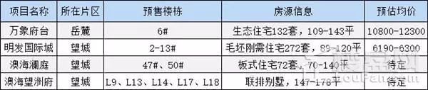據(jù)長沙住建委消息,昨日長沙共4盤拿證,分別是:(望城)澳海望洲府、明發(fā)國際城、澳海瀾庭;(岳麓)萬象府臺。其中前三個為老盤推新,另一個為新品入市。本次萬象府臺拿證樓棟位于二期6#,房源總數(shù)約132套(其中20套未注明是否可售),主力戶型為109平的溫馨三房,127平的精典四房,143平的輕奢四房,預(yù)售均價(jià)10800-12300元/平米。