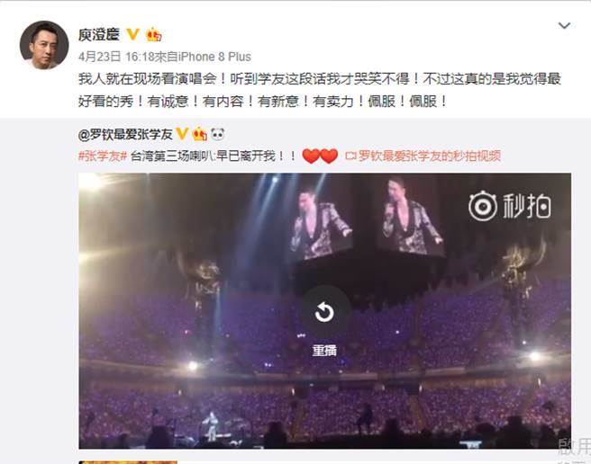 沒想到哈林其實就坐在臺下,事后庾澄慶則在微博轉發(fā)該段影片,并寫下:「我人就在現(xiàn)場看演唱會!聽到學友這段話我才哭笑不得!」不過他也大讚張學友演唱會有誠意、內容和新意。