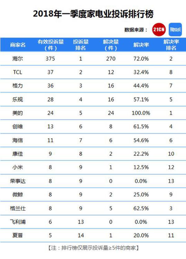 2018年一季度投訴量≥5件的商家,納入一季度行業(yè)投訴排行榜。上榜商家按投訴量排序為: