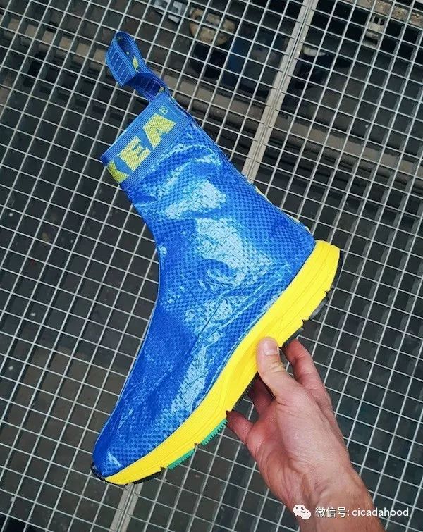 荷蘭設計師 Mathieu Hagelaars 就用 FRAKTA 做了一雙襪套鞋,算是替宜家回敬了巴黎世家。