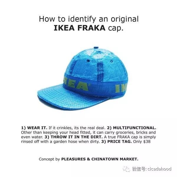 街頭潮牌 PLEASURES 與 Chinatown Market 就聯(lián)手打造了一款由 FRAKTA 制成的鴨舌帽,還像模像樣地學宜家給出一個鑒別指南。