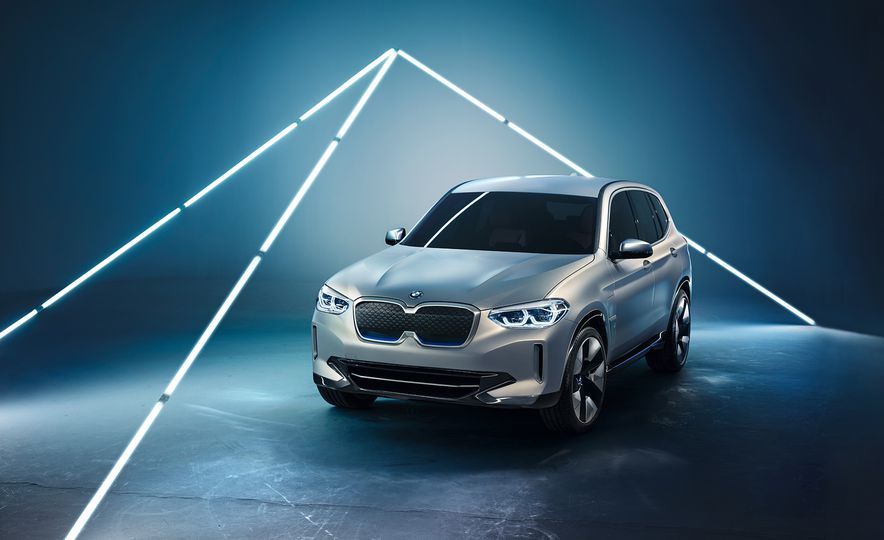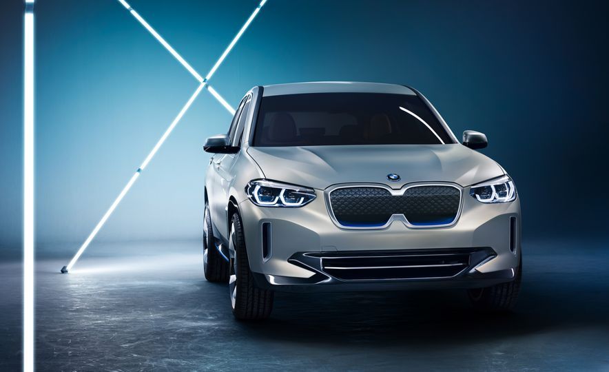 Concept iX3與X3 30i和M40i等同類車型在外觀上很容易區別開,可以看到許多不同的造型細節。 Concept iX3使用了雙腎式水箱罩輪廓,將內部直柵改為封閉式設計以降低空氣阻力。水箱罩下緣、車側下擺、后保桿分流器則帶有 BMW i 品牌特征的藍色涂裝,四只造型特殊的輪圈進一步將iX3確定為寶馬i系列的一員。