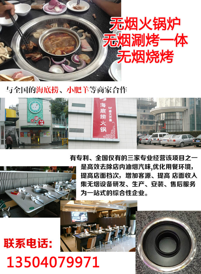 煙火鍋——中國(guó)醉安全的集成環(huán)保爐,集成環(huán)保爐打造無(wú)油無(wú)煙的火鍋店!誠(chéng)信品牌,火鍋新改革,共創(chuàng)環(huán)保又健康生活,自主生產(chǎn)研發(fā),發(fā)明專利,廠家直銷醉低價(jià)供貨!火鍋業(yè)界一直以上都存在一下問(wèn)題:火鍋消費(fèi)者和火鍋店的經(jīng)營(yíng)者,都對(duì)火鍋店堂揮之不去的油煙氣味,無(wú)不讓大家深受其害。有一款極具科技含量的產(chǎn)品,叫做無(wú)煙寶,能夠吸走90%以上的火鍋油煙和水蒸氣,是火鍋店提檔升級(jí)的“利器”, 中國(guó)火鍋業(yè)界也因此打響了一場(chǎng)席卷全國(guó)的“沒(méi)有硝煙的戰(zhàn)爭(zhēng)”。就經(jīng)營(yíng)者而言,火鍋的油煙氣對(duì)店堂的裝修也有極大的損害,長(zhǎng)期的“煙熏火繚”,再新的裝修效果,也會(huì)被油煙“腐蝕”得黯然失“色”。不僅如此,如果是老式的爐灶,由于燃燒不充分,還非常浪費(fèi)能源,真正被鍋利用和吸引的燃?xì)獠坏?0%。隨著時(shí)代的發(fā)展和進(jìn)步,人們的消費(fèi)水平不斷提高,餐飲業(yè)的環(huán)境得到了很大改善,無(wú)煙、衛(wèi)生、高檔的火鍋店也應(yīng)運(yùn)而生。其中,直排無(wú)煙火鍋爐無(wú)疑是打造無(wú)煙火鍋店一項(xiàng)非常了不起的發(fā)明創(chuàng)造。
